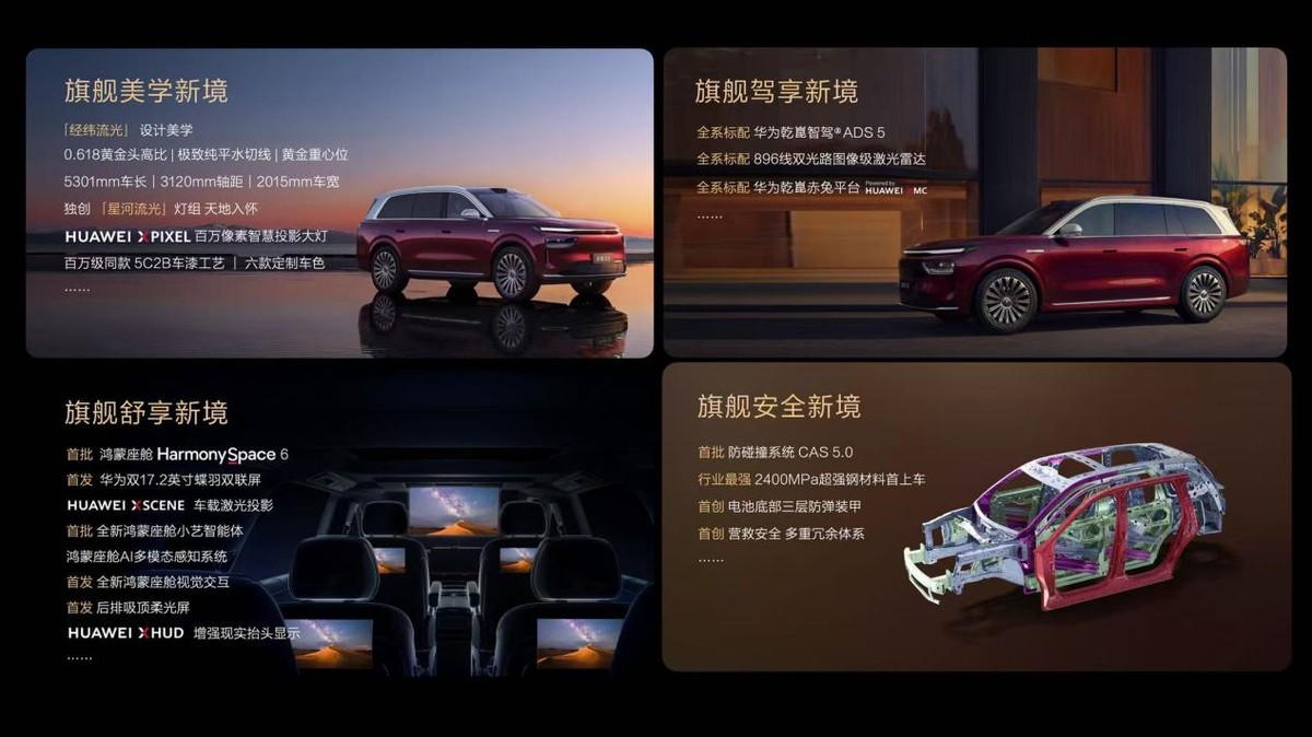 华为智能汽车解决方案BU CEO靳玉志现场发布奕境X9系列产品尖点,新车将全系搭载华为乾崑ADS 5,全系标配华为乾崑896线激光雷达,让每一个家庭都能享受最顶尖的科技!其次,全系标配基于HUAWEI XMC乾崑数字底盘引擎赋能的赤兔平台,结合百万级豪车才有的全铝底盘,搭配欧洲大师团队调校,将驾乘体验直接提升一个量级,完全不输超百万的旗舰SUV。
