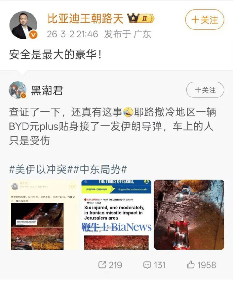 比亚迪王朝网销售事业部总经理路天转发相关新闻并表示,“安全就是最大的豪华”,侧面证实了事件的真实性。