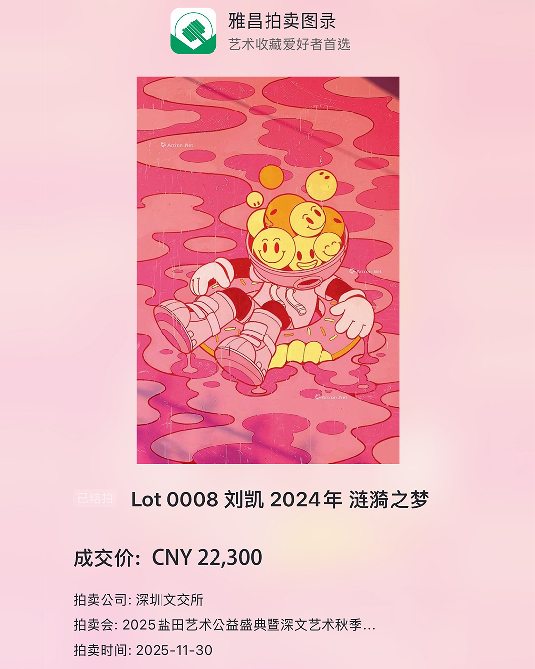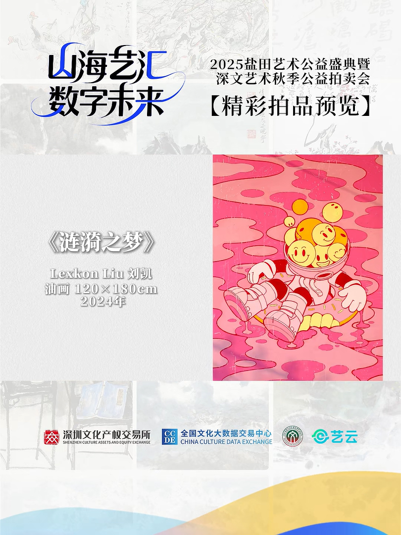 2025年11月30日,潮流艺术家Lexkon Liu的作品《涟漪之梦》在“2025盐田艺术公益盛典暨深文艺术公益秋拍”中于盐田区生物圈三号万科中心碳中和实验园区——雾之光井正式亮相,并以2.23万人民币成功成交。