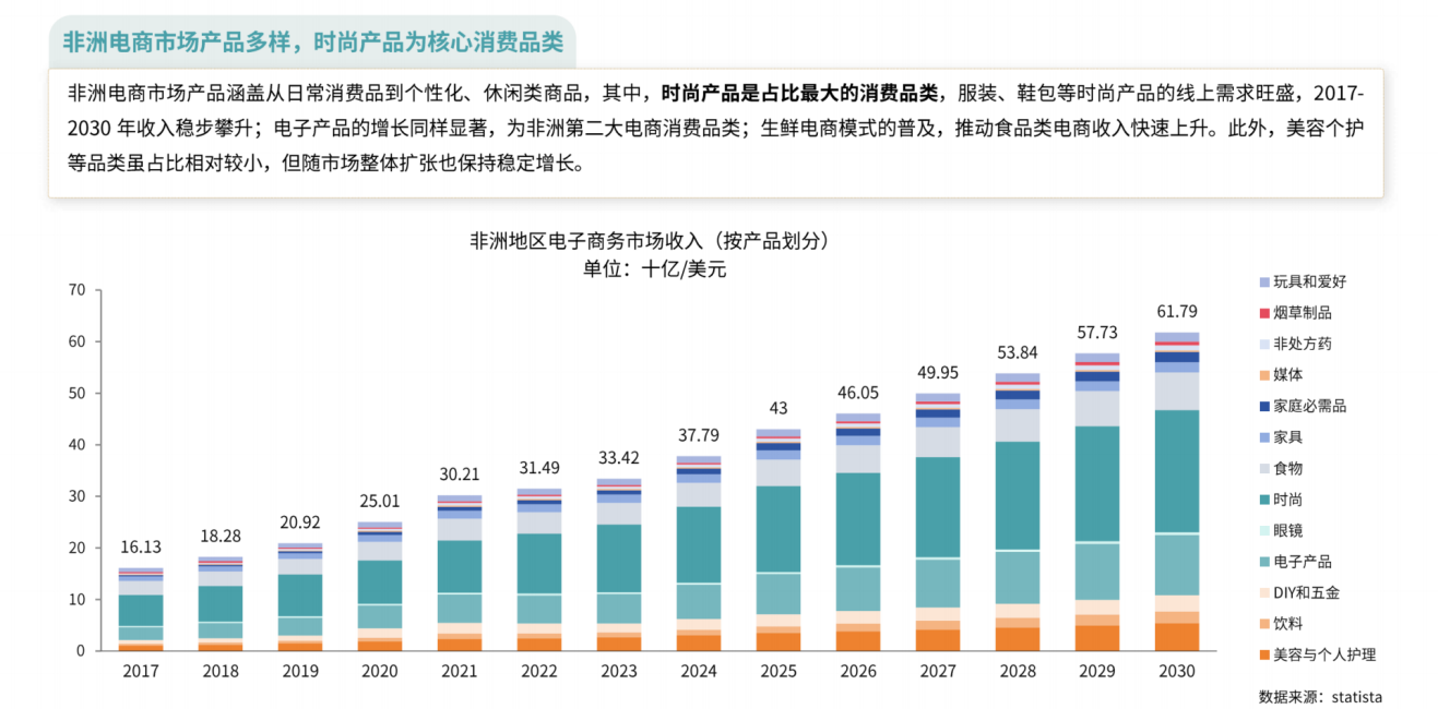 非洲消费者的购物车里,时尚产品和电子产品占据了绝对C位,年轻人口对服装、配饰的需求催生了年均两位数的增长,预计到2030年,时尚品类市场规模将突破230亿美元。