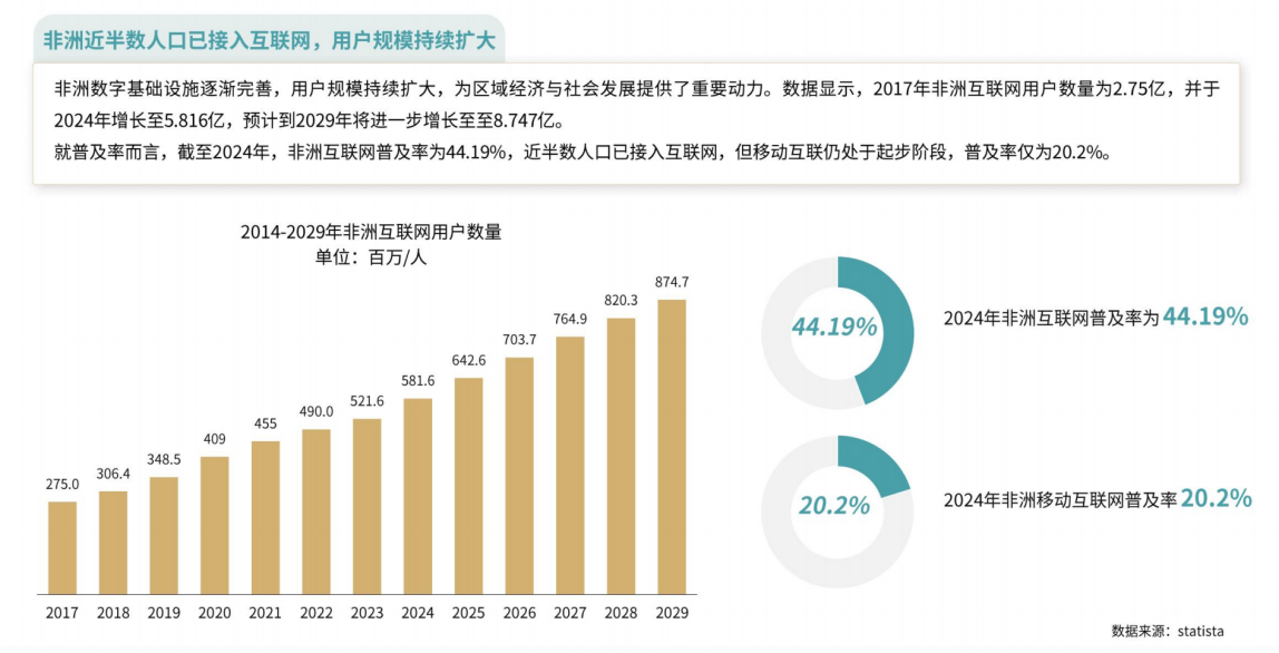 过去几年,非洲互联网用户从2.75亿飙升至5.8亿,移动支付的普及率也在南非、肯尼亚等国突破20%。这种变化直接推动了电商渗透率从13%跃升至40%,线上消费习惯从“尝鲜”变成了“刚需”。