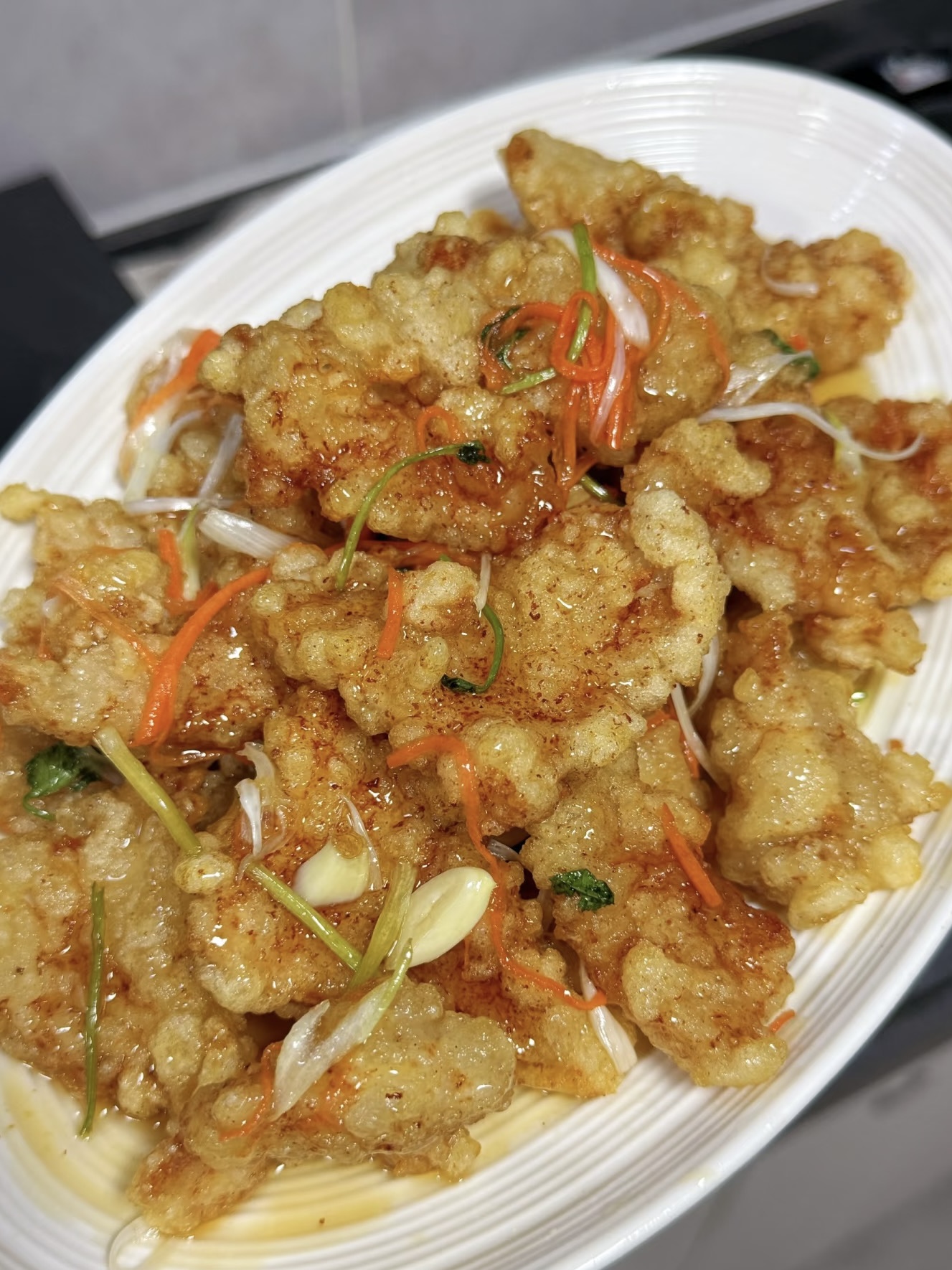 炸好的肉片、大葱丝、胡萝卜丝、香菜一起倒进锅里,颠锅!让酱汁像红毯一样裹住每片肉,外壳遇到酸甜蜜汁,“滋啦”一声脆响,冒出一团白雾,酸甜味顺着抽油烟机往上爬,猫在脚边转圈怀疑你在开罐头。整个过程不超过二十秒,拖延症慎入,否则外壳吸水变软,前面所有努力直接清零。