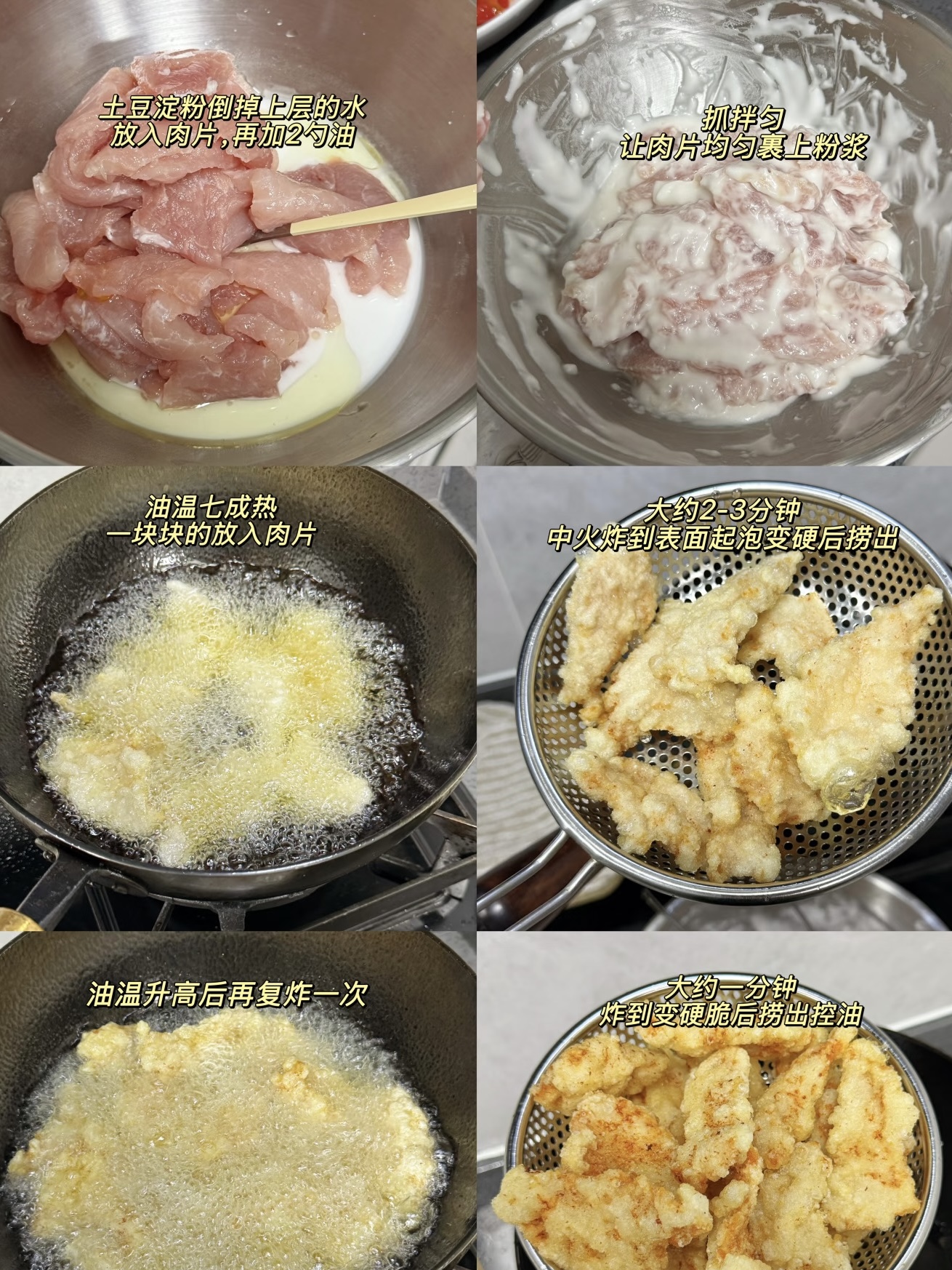 炸肉分两步,耐心是脆的关键。锅里倒油,量能没过肉片即可,中火升到七成热度——木筷下锅冒密集小泡,像一群小螃蟹吐口水。把肉片一片片滑入,别扔,油花会亲你。第一遍中火2分钟,表面起泡变硬就捞出,这时候外壳浅黄,像刚烤好的棉花糖。歇两分钟,油温继续升高到八成热,复炸30秒,外壳颜色瞬间从奶茶棕升级到焦糖咖,硬脆度+100%,控油捞出,听声音——“咔啦咔啦”才是合格毕业证。