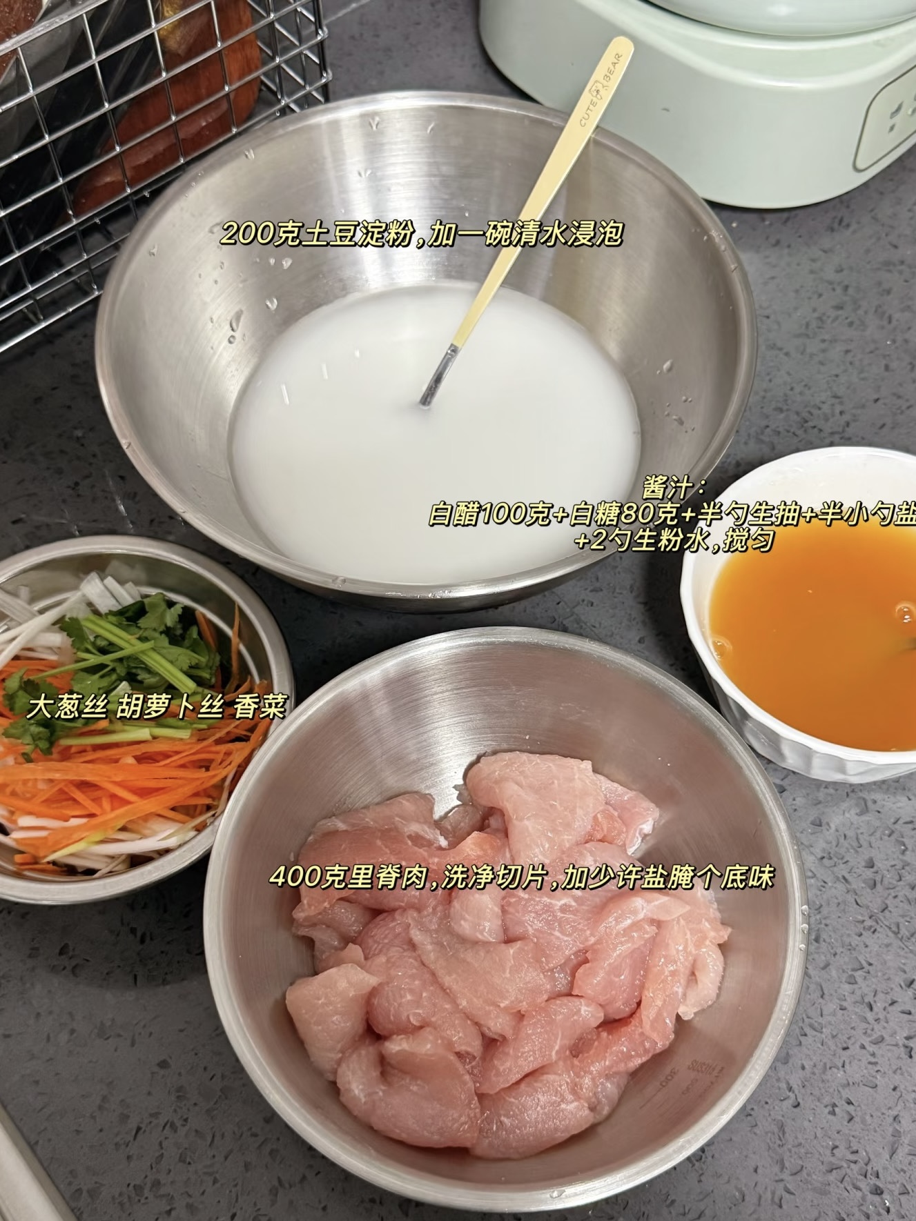 选肉是第一步玄学。里脊要粉嘟嘟、按压回弹快,脂肪纹路少,炸完才不柴。400克刚好一盘,逆纹切0.5厘米厚片,别学大厨切超薄,家庭灶火力小,厚点才撑得住外酥里嫩。切完冷水冲两遍,赶走血水,挤干加半小勺盐抓匀,给肉一个“底味SPA”,腌十分钟去去腥,顺便把后面酸甜味衬得更干净。