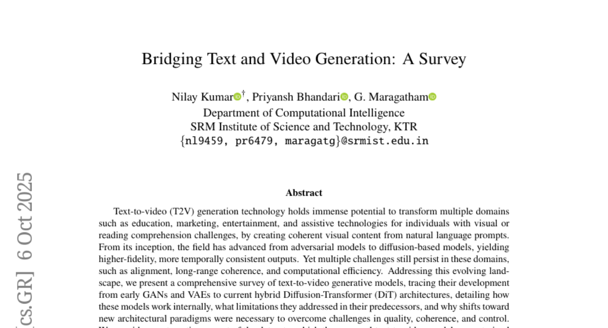 这项由印度SRM理工学院计算智能系的Nilay Kumar、Priyansh Bhandari和G. Maragatham教授共同完成的综合性研究发表于2025年10月的arXiv预印本平台,论文编号为arXiv:2510.04999v1。该研究首次系统性地梳理了文本到视频生成技术的完整发展脉络,为这个快速发展的人工智能领域提供了迄今为止最全面的技术演进图谱。