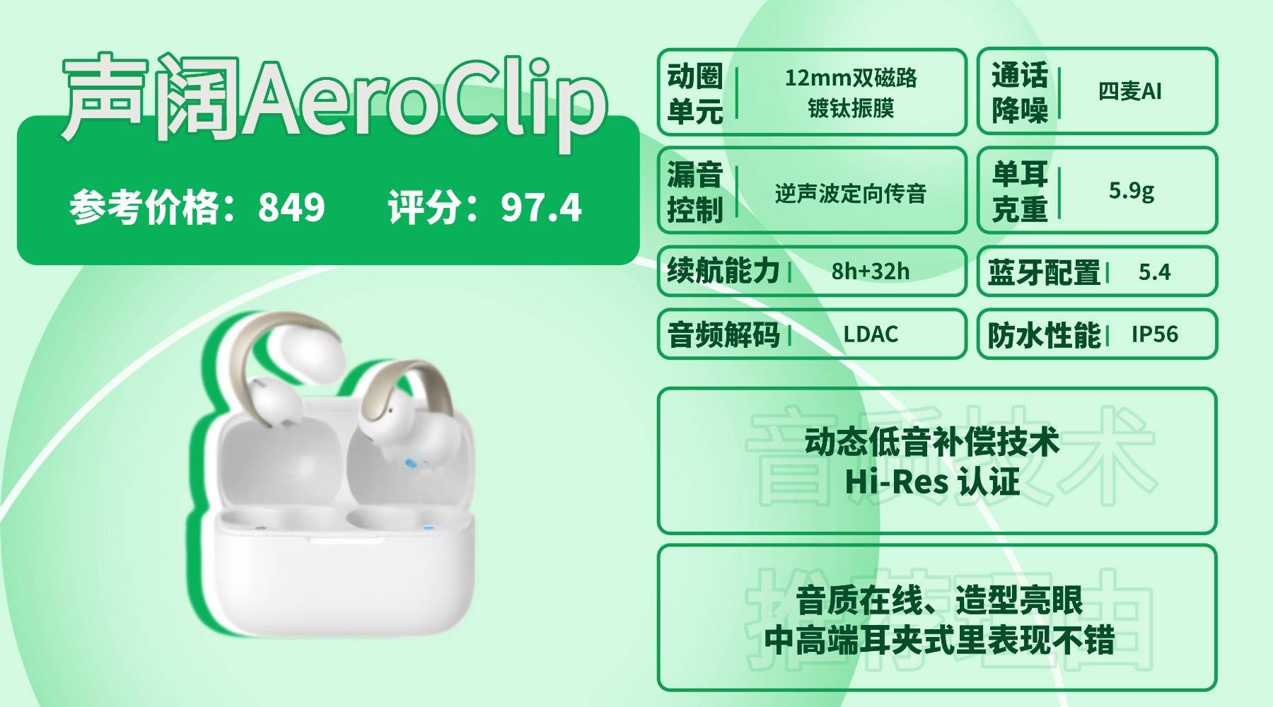 耳夹式耳机好用吗,AeroClip 单耳 5.9g,舱体线条流畅,搭配 360° 分压结构与加长弧形 C 桥,使佩戴更稳固,但饱满耳翼会轻微顶到耳廓。12mm 双磁路镀钛振膜支持 LDAC,解析细节到位,听现场、人声氛围优秀,只是低频冲击力不算激烈,偏向自然耐听。蓝牙 5.4 连接稳定,续航 8h + 32h 足够通勤使用,重度用户可能需要中途补电。