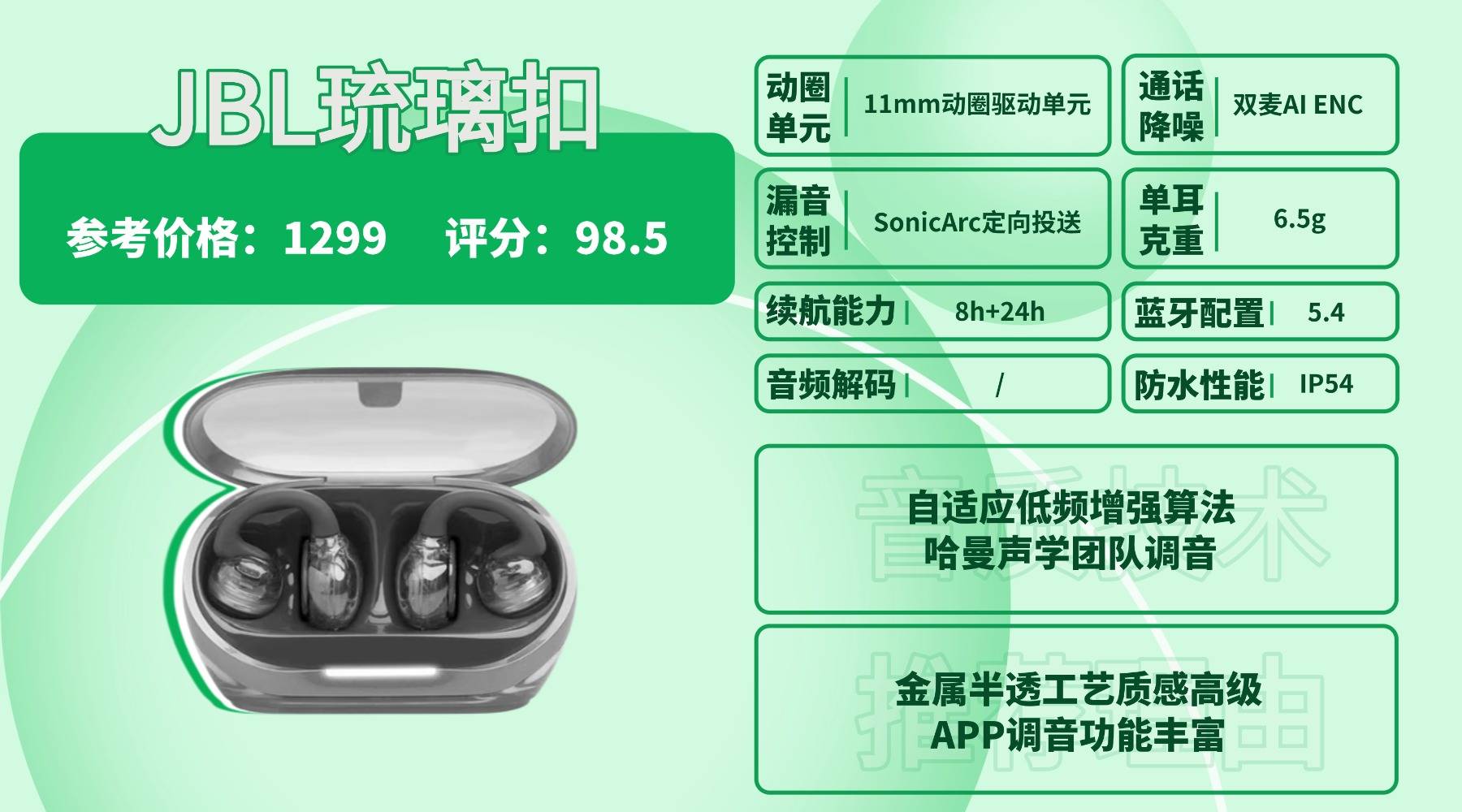 耳夹式耳机好用吗,JB L 延续品牌标志性的半透明外观,看起来更像饰品而不是传统耳机,通勤、出街都很加分,唯一不足是充电仓偏宽厚,单手开合时不太顺手。C 形桥搭配亲肤 TPU,虽然单耳 6.5g 不算特别轻,但初次上耳舒适度不错,只是长戴后会稍微有一点存在感。音质部分配备 11mm 动圈与镀钛双层振膜,解析与人声表现干净自然,自适应低频算法能带来扎实的低频,但极低频下潜相对保守。功能上具备双麦 AI 降噪、SonicArc 定向声波技术和 ENC 加持,在嘈杂环境下讲话也能保持清晰。蓝牙 5.4 搭配 LE Audio 连接稳定、延迟低,同步性好。