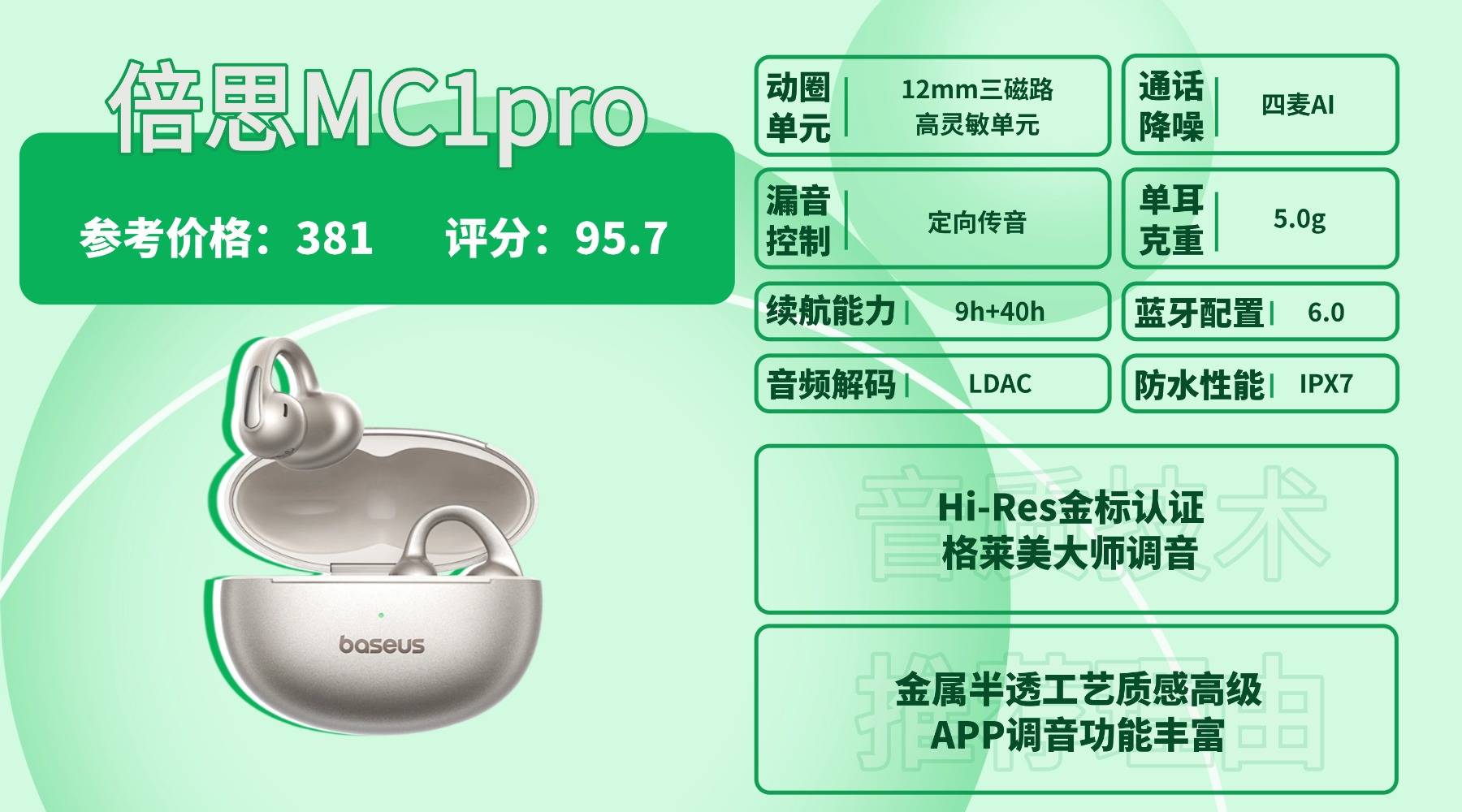 耳夹式耳机好用吗,倍思 M C1 Pro 单耳仅 5g,耳挂采用 0.5mm 钛合金丝结合云朵气囊 Pro,既贴耳又不夹耳,但因耳挂较细在运动时偶尔会轻微晃动。音质部分凭借三磁路高灵敏单元与 Hi-Res 金标认证,整体音色偏均衡细腻,低频量感适度但不算猛烈。蓝牙 6.0 连接顺畅,DeepSeek AI 模型让语音指令反应灵敏,只是完整功能需依赖 App。续航表现出色,关闭低频增强时单次约 9 小时,总续航约 40 小时,覆盖一天使用无压力。