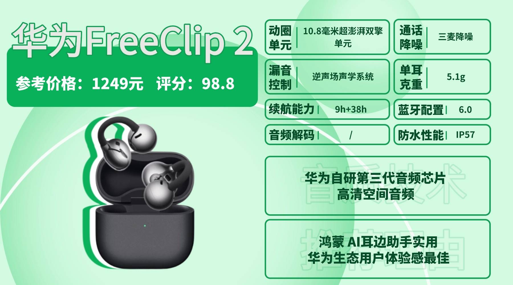 耳夹式耳机好用吗,Fre eC lip 2 单耳约 5.1g,采用云感 C 形桥结构,上耳轻盈又稳固,适合全天候佩戴。设计延续交叠式造型,充电盒体积更小巧,工艺细腻但盒盖阻尼偏紧,单手开盖不太好使。音质上使用第三代自研音频芯片,配合双擎单元与高清空间音频,高频延展稍偏保守但整体耐听。蓝牙 6.0 带来迅速稳定的连接,同时支持鸿蒙 AI 交互,点头、摇头即可接听或拒接电话,整体体验智能化程度高,不过定价走高端路线,更适合看重华为生态与交互体验的人。
