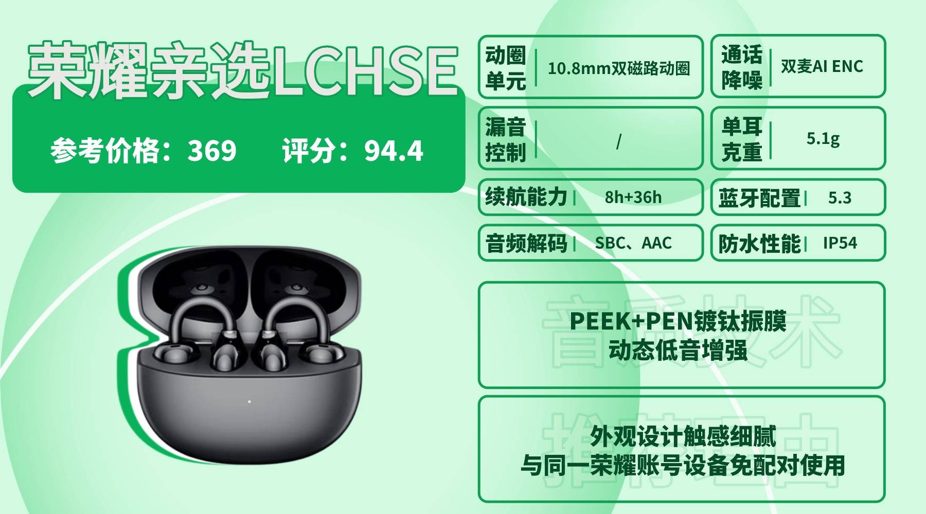 耳夹式耳机好用吗,荣耀亲选单耳约 5.1g,佩戴轻盈贴耳,耳夹结构能较好贴合耳型,适合久戴。音质方面配备 10.8mm 双磁路动圈与 PEEK+PEN 镀钛振膜,中频人声细腻通透,空间环绕声带来一定临场感,但默认关闭需手动开启。蓝牙 5.3 延迟低,支持语音助手与双设备切换,但 App 设定较多,需要一定适应成本。续航单次 8 小时,总续航约 36 小时,覆盖一整天使用轻松无压力。