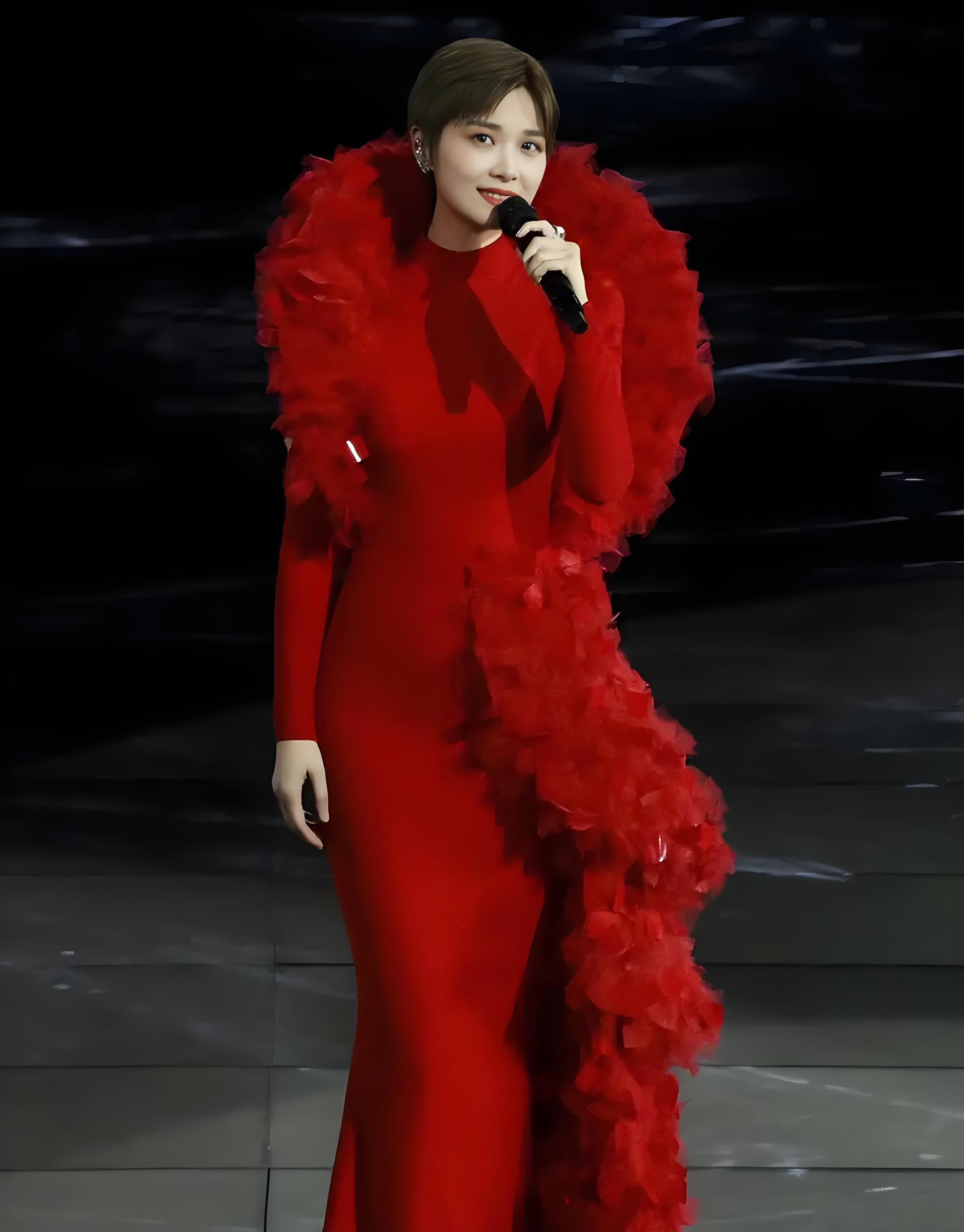 当晚,李宇春身着一袭露背鱼尾裹身礼服裙惊艳亮相。那高挑的身形在礼服的完美勾勒下,宛如从梦幻画卷中走出的仙子,每一处线条都散发着独特的魅力,亮眼又吸睛。礼服的颜色喜庆大气,仿佛自带光芒,而开叉的设计更是神来之笔,为整体造型增添了几分性感韵味,这与她以往的中性酷飒风格形成了鲜明的反差。