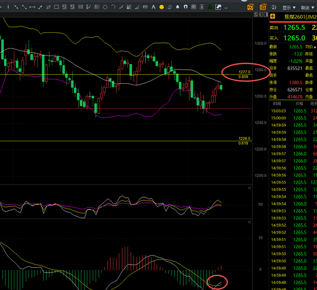 技术面:焦煤短线支撑1250,强支撑1225,压力1277,强压力位1327,今日触底后强势反攻晚间看后续得延续是否能有效持续上攻,第一压力1277