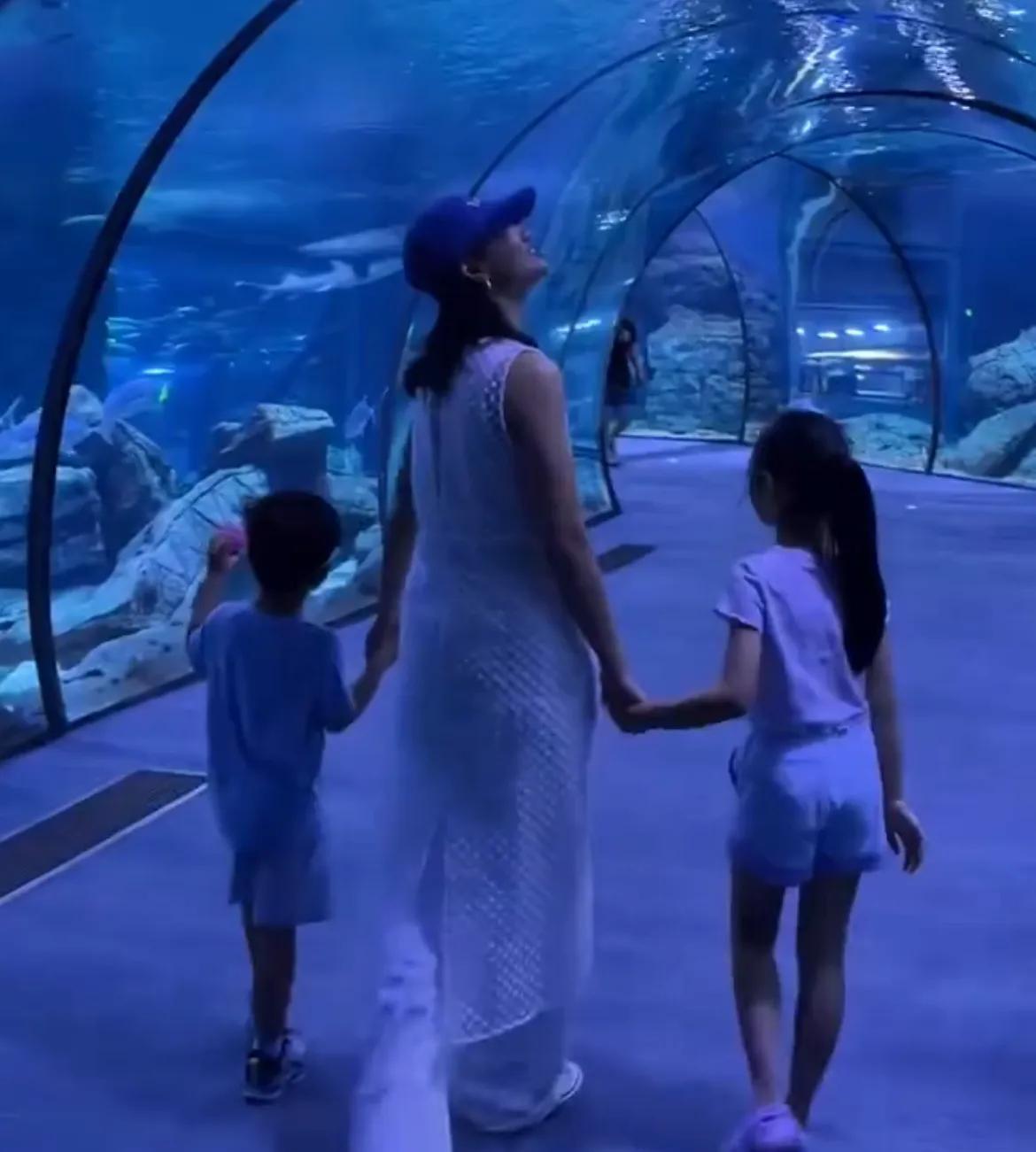 朱丹带着5岁的儿子和8岁的女儿共度亲子假期。孩子们在海洋公园尽情探索,对各类海洋生物充满好奇。