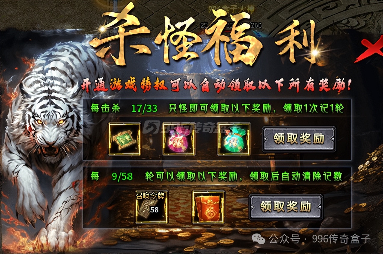 击杀33个怪,就能去杀怪福利处领取奖励,给会员证和货币福袋。每领取一次福利,杀怪量就会清零,开通特权可以自动领取,所以白嫖或者首充玩家要多关注,及时领取福利。福利领取58次,还会有额外的次数奖励,给BOSS召唤令和福利红包,领取后次数清零!同样需要及时领取的免费玩法还有四大神剑!四把飞剑,刷怪可以免费激活,每把需要的刷怪量会递增。领取飞剑后清零,所以要及时领取,飞剑也能快速提升群怪效率!