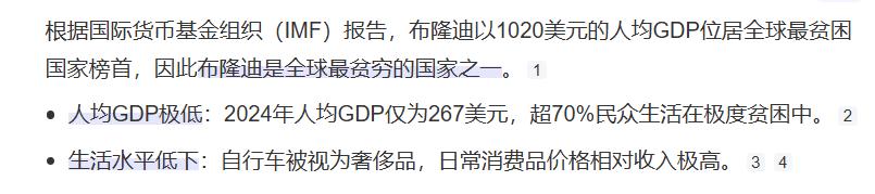 布隆迪确实是世界上最贫穷的国家之一,世界银行数据显示,2024年布隆迪人均GDP仅约154美元,按每天3美元贫困线计算,贫困人口占比超过74%。