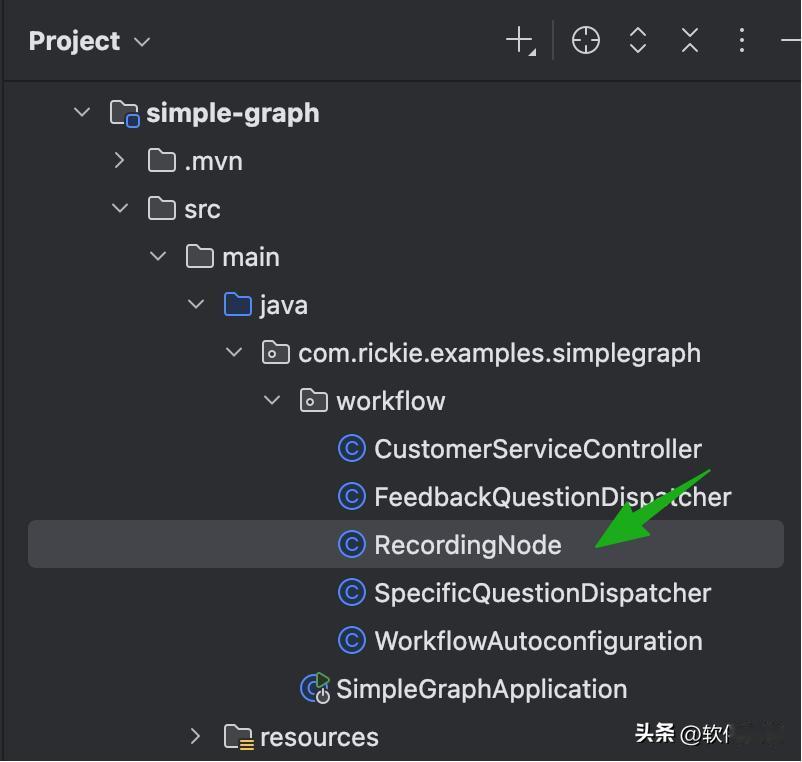 通过构造函数或 Builder 注入:输入文本在状态中的键 inputTextKey、类别列表categories、分类指令classificationInstructions、输出键 outputKey、ChatClient。从 OverAllState 读取输入文本(inputTextKey 对应的值)。构建 few-shot 示例:手工加入两组 用户/助手 消息,作为分类示例。使用 SystemPromptTemplate 渲染系统提示(包含占位符: inputText、categories、classificationInstructions)。发送对话:chatClient.prompt().system(...).user(inputText).messages(few-shot).call()取模型返回文本,放入 updatedState 的 outputKey。如果原状态里存在 messages 键,则附加当前输出消息对象。返回新的局部状态 Map(供外部合并)。接下来,自定义的 RecordingNode 节点用于记录和处理最终结果: