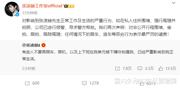 张凌赫的工作室也转发了这条微博,并声明:“对于严重干扰张凌赫先生工作和生活的行为,如在他的私人住所围堵、强制跟踪并拍照,我们已经报警,寻求警方的协助。我们再次强调:对于非公开行程的围堵、偷拍、跟踪,以及任何形式的跟车、追车等恶劣行为,我们表示最强烈的谴责!”