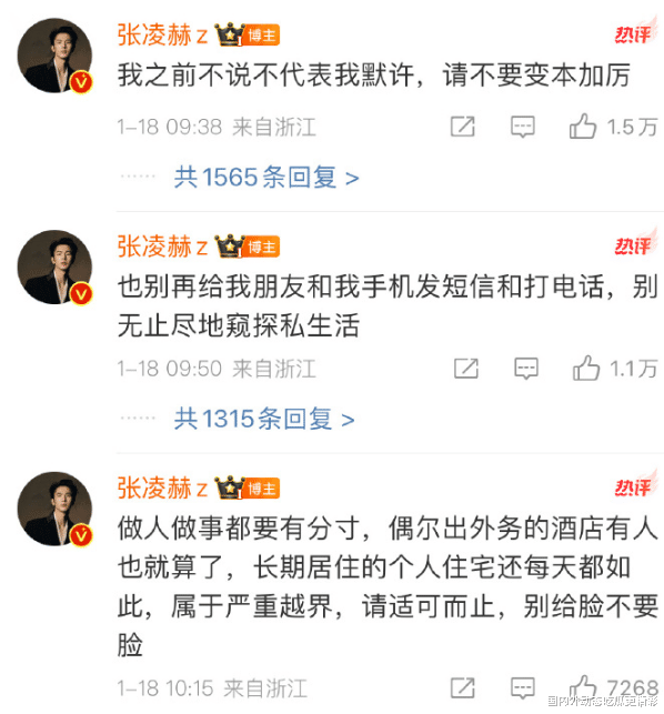 在评论区,张凌赫补充说:“我之前的沉默并不代表我同意,请不要得寸进尺。”“也请不要再给我的朋友和我发送短信、打电话,不要无休止地侵犯我的私生活。”“请掌握分寸,偶尔在酒店外遇到粉丝还可以接受,但我的常住住宅每天都被这样骚扰,实在是过分,请适可而止,别不识趣。”