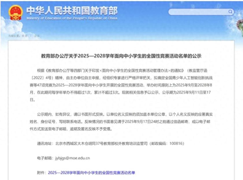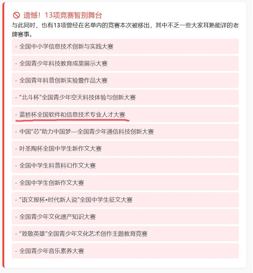 2025年9月11日,教育部公示了2025—2028学年面向中小学生的全国性竞赛活动名单,俗称“白名单”。47项竞赛榜上有名,但引人瞩目的是,蓝桥杯大赛不在名单之列。