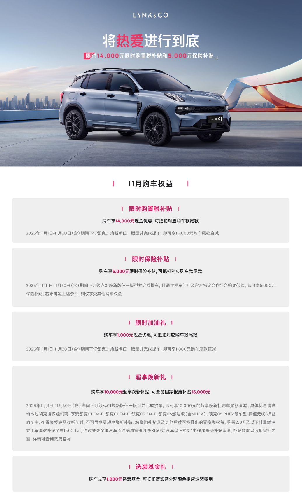 现阶段购买领克01焕新版可享受多重购车优惠:14000元限时购置税补贴直接降低购车门槛;5000元保险补贴与1000元加油礼有效减轻用车成本;置换用户可享10000元焕新补贴,还可叠加15000元国家报废补贴;此外还有1000元选装基金可供使用。这些福利政策让高品质SUV的拥有门槛大幅降低。