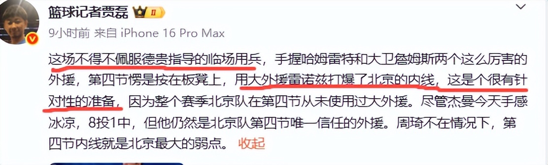 这场比赛可以说,张德贵太有谋略了,从教练角度讲他完胜许利民,贵叔用一个场均7分之人彻底打爆北京队,可见贵叔是用兵如神啊,在什么时候用什么人?贵叔想得和准备得都很周到。赛后北京篮球记者贾磊猛夸了老帅贵叔,表示不得不佩服张德贵指导,他说,“这场不得不佩服德贵指导的临场用兵,手握哈姆雷特和大卫詹姆斯两个这么厉害的外援,第四节愣是按在板凳上,用大外援雷诺兹打爆了北京的内线,这是个很有针对性的准备,因为整个赛季北京队在第四节从未使用过大外援。”没错,第四节内线就是北京最大的弱点,而张德贵指导却很好的抓住了北京队的弱点,进而逆转北京队。