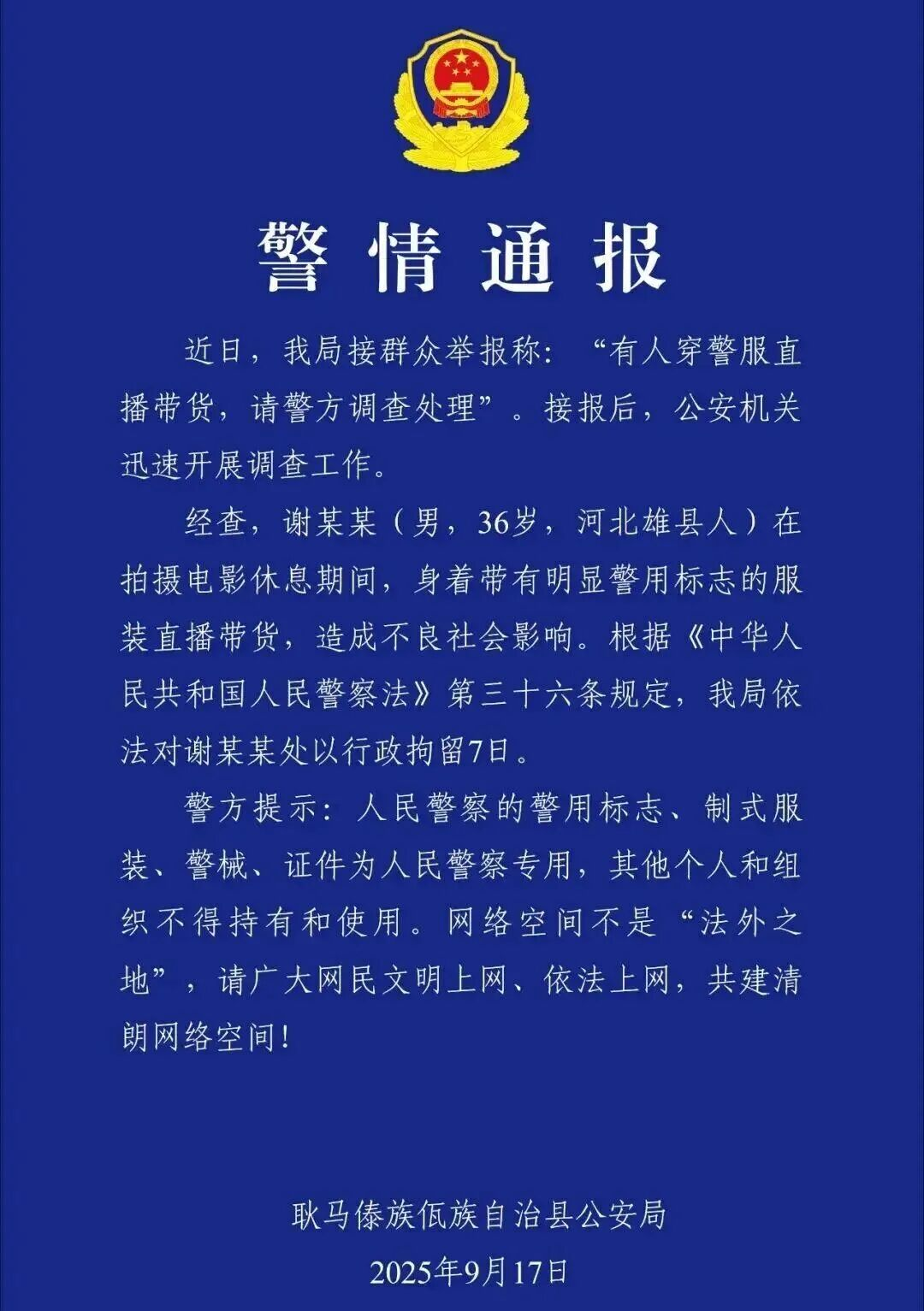 穿警用仿真服直播时宣称"省厅重点项目,公安都得配合",结果被举报后云南警方称其造成不良社会影响,决定对其行政拘留7天。