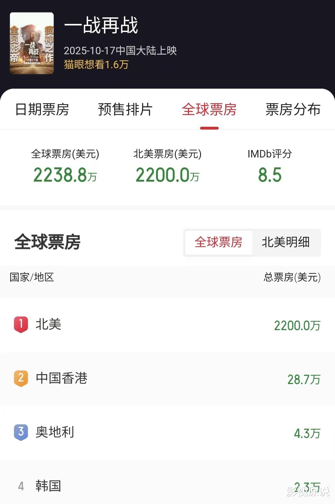 除了北美本土之外,《一战再战》也有登陆中国香港、奥地利、韩国等市场,但它在三天的时间里,却只收获了2240万美元票房,换算成人民币还不到1.6亿。