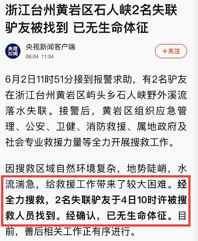 6月4日,据媒体报道,台州黄岩区石人峡两位失联的驴友已经找到了,遗憾的是,打捞上来后已经没了生命体征,该消息一出,引发了不小的热议。