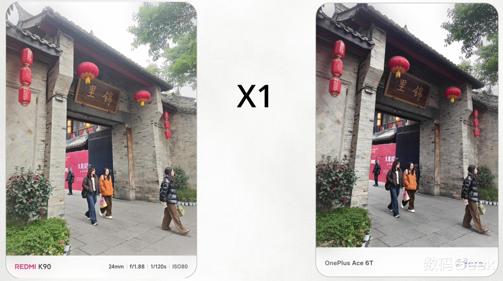 红米K90则走的是第一眼惊艳路线,色彩鲜明、对比度高,直出照片更抓眼球。但有时会出现用力过猛的情况:人像偏色、修饰过度、夜景涂抹感较重。长焦镜头的加入确实拓展了拍摄场景,2.5倍光学变焦在日常使用中很实用。