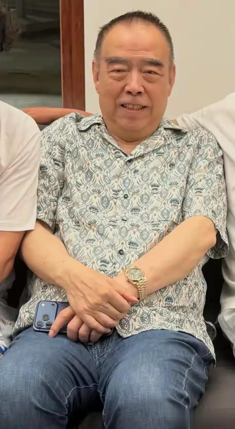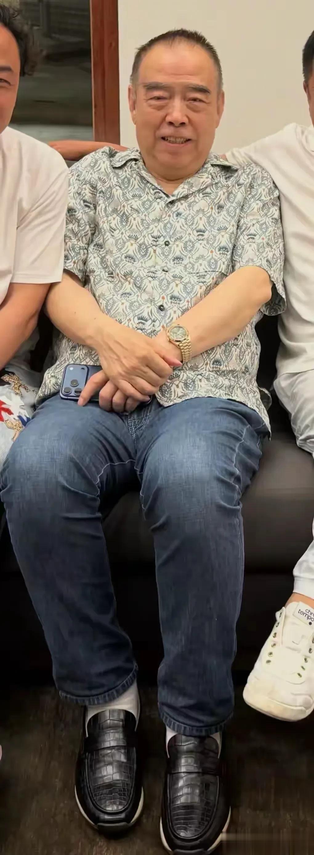 穿搭看着比较普通,上衣是花衬衫,裤子是浅蓝色牛仔裤,一身简单搭配干净利索,一点都儿不像古稀老人,身上有一种清爽感。