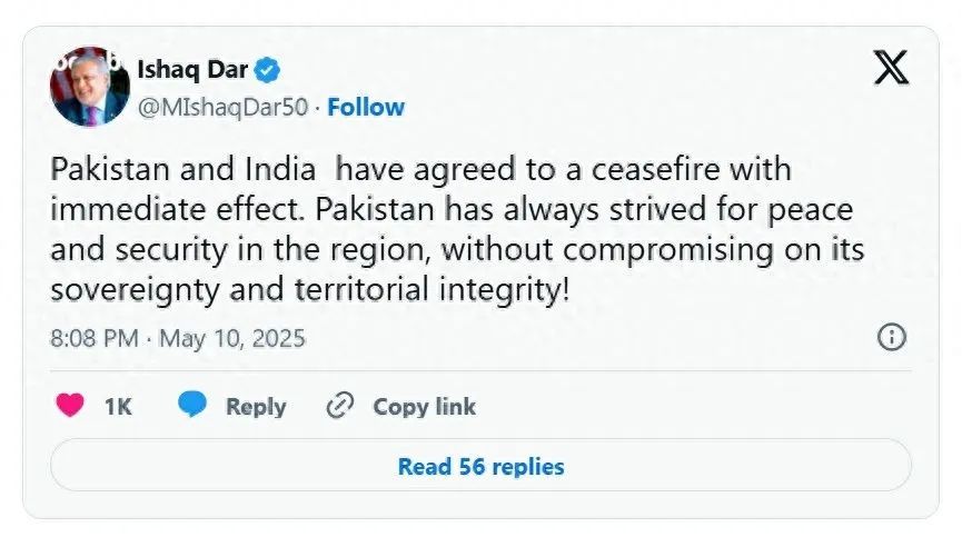 巴基斯坦副总理兼外长达尔通过社交媒体“X”发布消息称,巴基斯坦和印度已达成立即生效的停火协议。