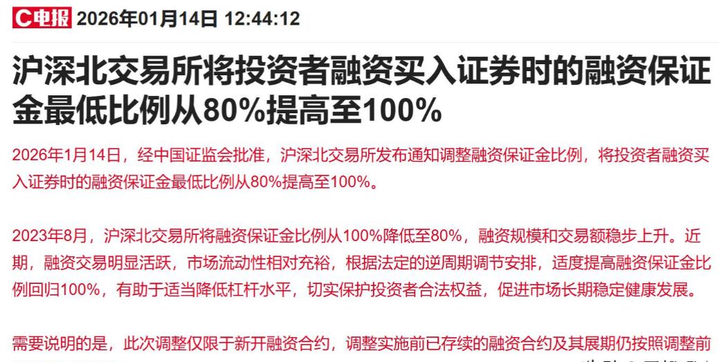 今天的A股市场可以说相当不太平,不仅波动剧烈,更重要的是行情走得非常突然。这一切都要从午间收盘后突然传来的一则消息说起——2026年1月14日,经过中国证监会批准,沪深北三家交易所联合发布通知,宣布调整融资保证金比例,把投资者融资买入证券时的最低融资保证金比例从原来的80%上调到了100%。消息一出,市场情绪瞬间收紧,午后开盘,三大指数几乎是直线跳水,盘中虽然有过一些反弹的尝试,但是很快就被更多的出逃资金给压了下去。尽管我们也看到有部分资金在逆势布局、试图抄底,但整体来看,市场的恐慌情绪还是相当明显的。
