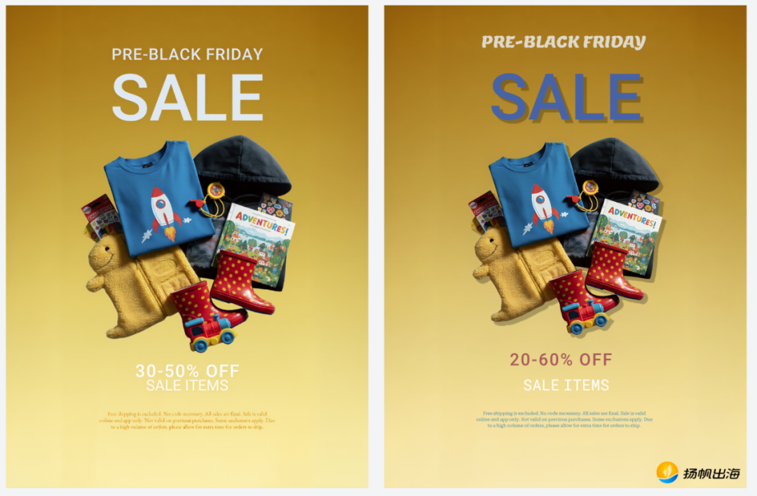 以下面这张黑色星期五宣传海报为例,图像可被拆分为7个独立图层,包括黄色背景、物品主体以及5组英文文字。用户可对每个图层进行灵活调整:文字部分支持修改颜色、字体、对齐方式与行间距等;图像部分则支持移动、缩放、透明度调整,甚至包括背景擦除、画面扩展、阴影添加、模糊效果等高级编辑,还可支持B端用户的Logo嵌入需求。
