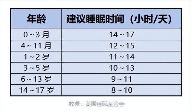 根据美国睡眠基金会的研究,幼儿园的孩子至少要睡10个小时,小学要睡9小时,初中不少于8小时,具体可参考下面这张表。