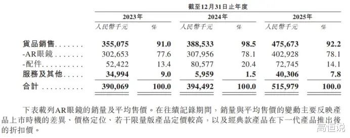 从业务结构来看,XREAL仍是一家以AR眼镜硬件销售为核心的消费电子公司。招股书显示,2023—2025年,公司总收入分别为3.90亿元、3.94亿元和5.16亿元;其中货品销售收入分别为3.55亿元、3.89亿元和4.76亿元,占总收入比重91.0%、98.5%和92.2%;同期AR眼镜收入分别为3.03亿元、3.08亿元和4.03亿元,一直是公司最核心的收入来源。相比之下,服务及其他收入体量较小,难以改变公司以硬件为主的基本盘。
