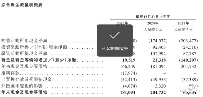 尽管各项费用总体下降,但出货规模未扩大,成本压力仍在,最终反映在现金流上。2023—2025年,公司经营活动产生的现金流净额连续三年为负,分别为-4.72亿元、-1.74亿元、-2.04亿元;截至2025年末,账上现金及现金等价物仅6363万元。