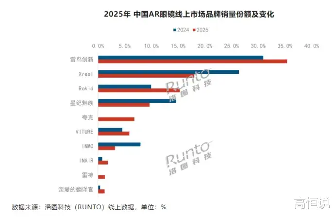 这种分化也反映在竞争格局上。洛图科技数据显示,2025年XREAL国内线上市场份额从2024年的25%下滑至20%,降幅近5个百分点;同期雷鸟创新以35.4%位居第一,同比提升4.5个百分点;Rokid份额15.3%,同比上涨5.4个百分点,成为黑马。
