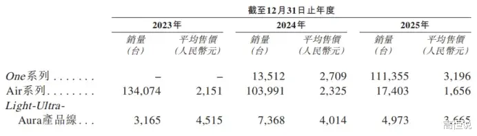 销量和价格的变化很直观。2023—2025年,Air系列销量分别为13.4万台、10.4万台和1.7万台,平均售价2151元、2325元、1656元;One系列在2024年开始规模化,销量1.35万台、平均售价2709元,2025年跃升至11.1万台,平均售价3196元;Light-Ultra-Aura产品线销量仅数千台,平均售价保持在3665—4515元区间。