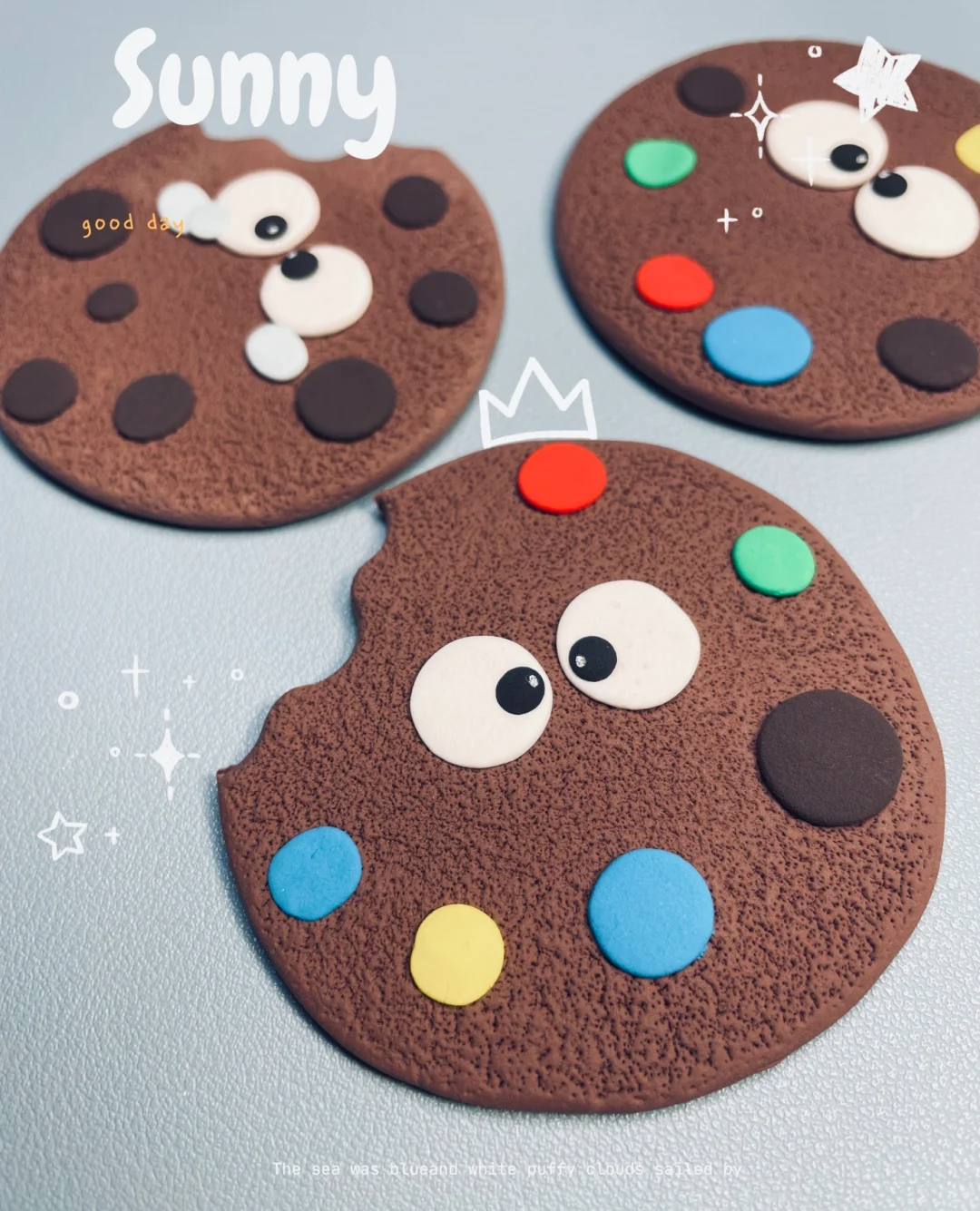 就拿这个曲奇杯垫来说吧,看起来非常可爱,于是决定动手搞一个。找到咖啡色粘土,滚成圆圈之后,直接用亚克力板压平。