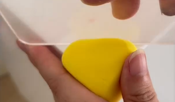 只要把粘土搓成球,然后放在身体乳的盖子上直接压平,然后再把勺子按进去。
