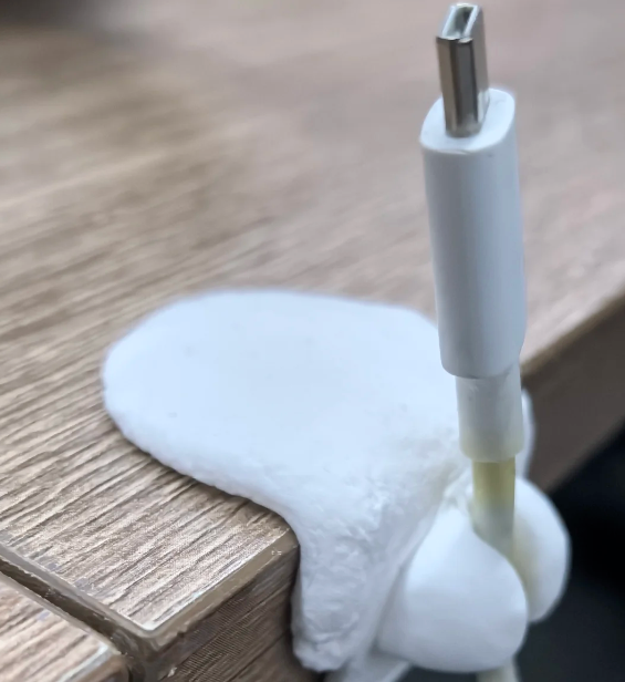 方法特别的简单,只需要拿出一块粘土,然后把它贴在桌角。直接把数据线压进泥土里。