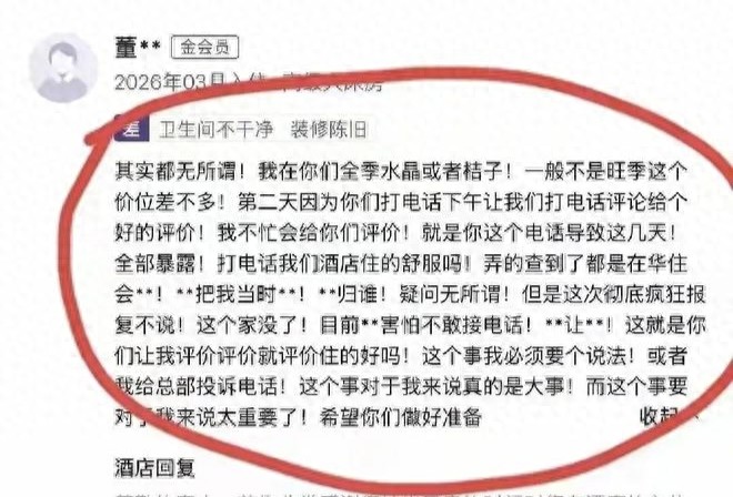 2026年4月18日,记者在华住会APP上看到,大同政务大厅万达广场桔子水晶酒店的评价详情里,出现了一条特别的差评。账号名叫董某某,金会员,2026年3月入住。
