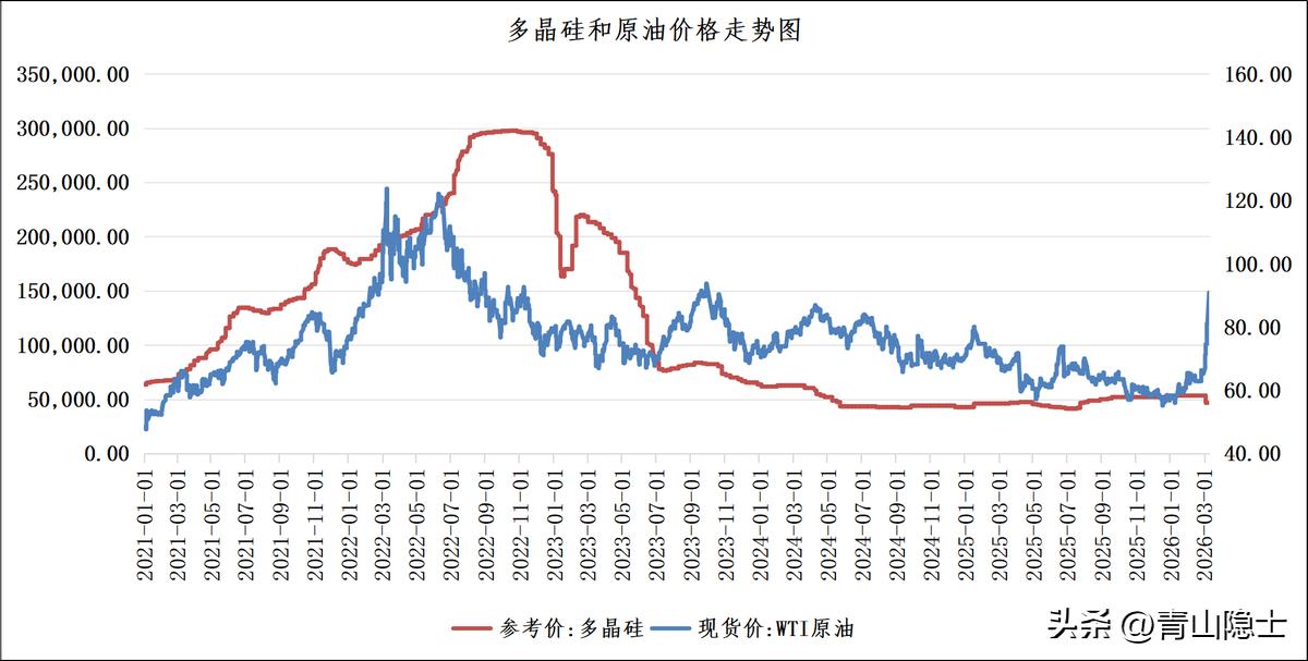 这一巨大价差背后,是当前光伏行业产能过剩、需求阶段性疲软的现实约束,也暗含着“困境反转”的投资逻辑。若后续地缘风险持续推高油价,同时光伏产能出清加速、海外装机需求超预期,多晶硅价格有望逐步向历史相关性中枢回归,届时将释放出可观的估值修复弹性,成为能源转型背景下兼具周期与成长属性的核心投资机会。