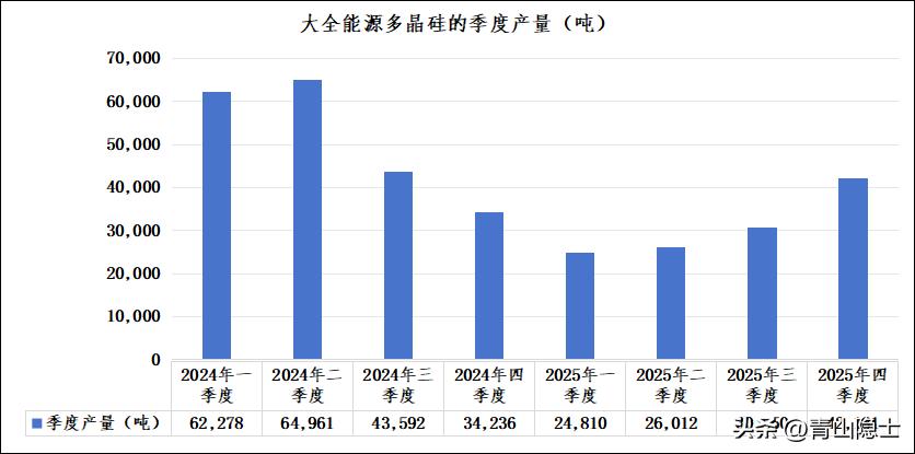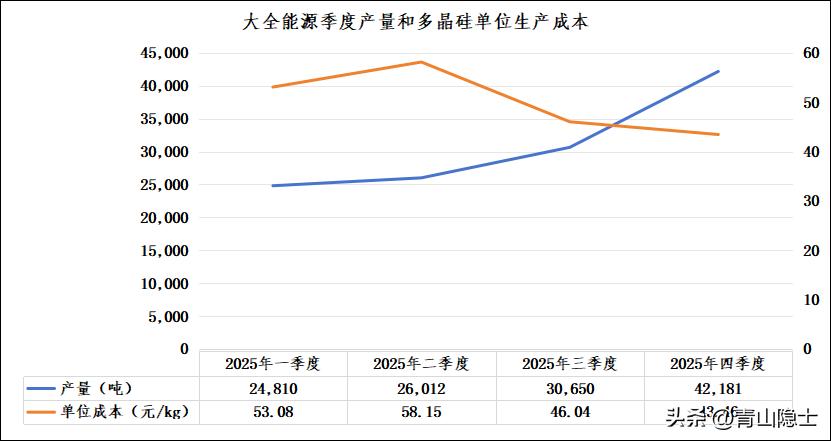 产量方面,2025年四季度大全能源实现季度产量4.22万吨,这一产量水平并非公司的生产极限,仍有显著的提升空间。结合公司公开信息,其多晶硅综合产能已达到30.5万吨/年,2025年四季度产能利用率仅为55%,相较于行业合理产能利用率及公司自身产能潜力,季度产量仍有较大提升空间,预计单季度产量可提升至7.63万吨左右,较当前最高季度产量4.22万吨可提升3.41万吨,提升幅度约80.81%。