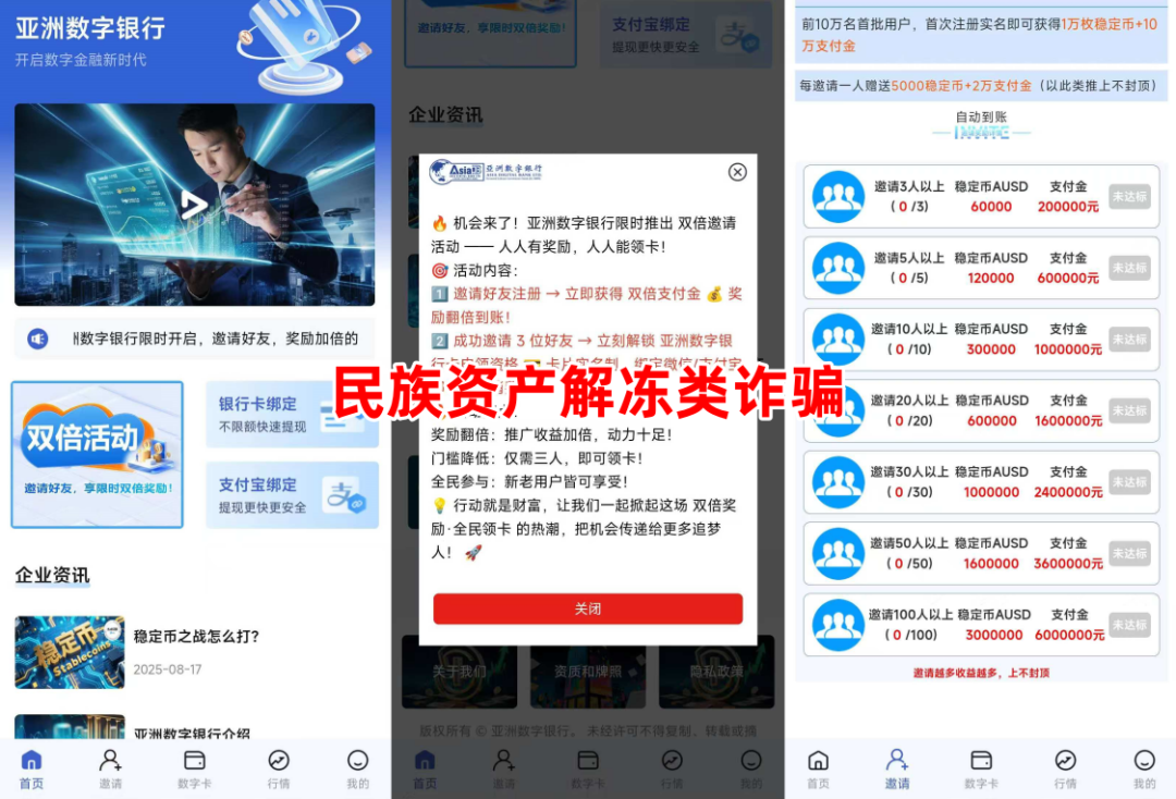 虚拟货币类诈骗。不法分子冒充“亚太投资银行”的名义,制作散布涉诈APP,声称实名注册即可获得2万稳定币,20万支付金,邀请人越多,奖励越多。