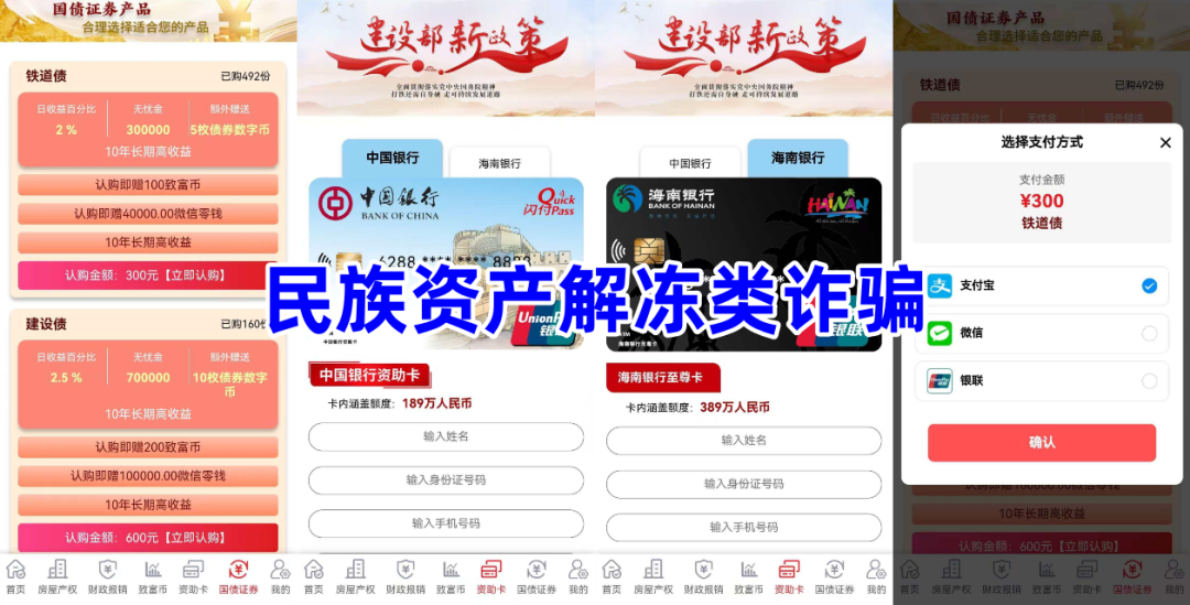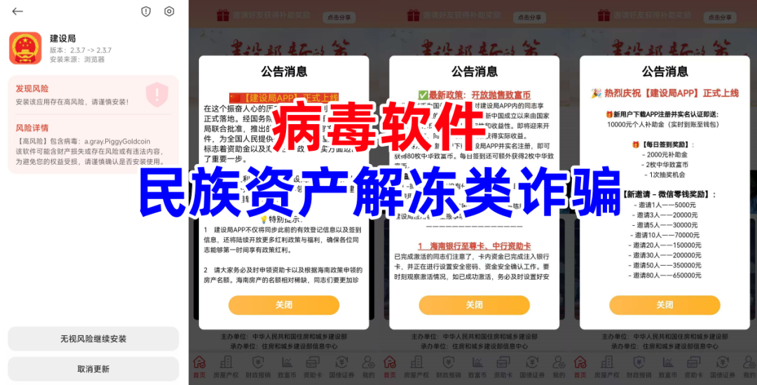 不法分子冒充“国家某部门”的名义,制作散布涉诈APP,声称参与者实名注册即可获得10000元个人补助金,提供个人信息,免费领取房产、缴纳费用办理银行卡,可领取189万、389万资助金。
