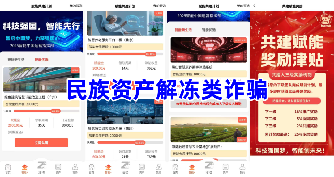 不法分子打着“推进数字中国、智能中国建设”等旗号,制作散布涉诈APP,虚构推广“绿色建筑智慧节能改造工程”“智慧养老服务平台工程”“智慧防灾减灾应急系统”“崂山智慧康养数字津贴系统”等高额返利理财项目。