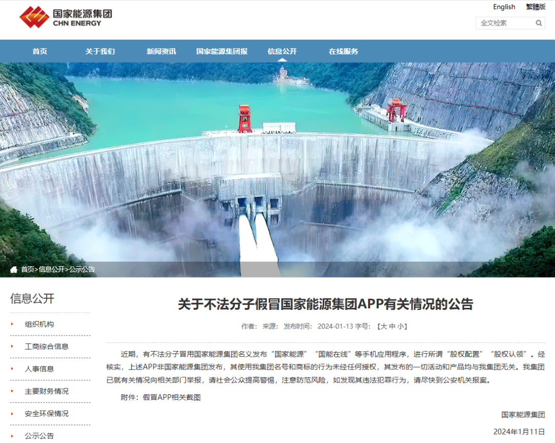 不法分子冒充“国家能源集团”公司的名义,制作散布涉诈APP,虚构推广高额返利理财项目实施诈骗。