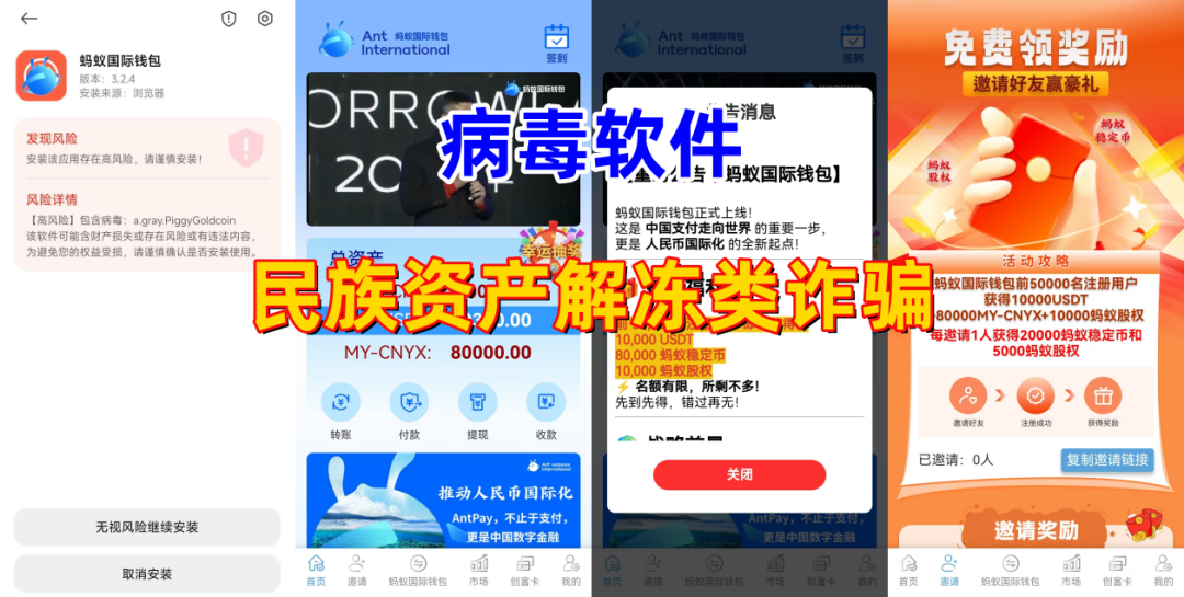 不法分子冒充“蚂蚁科技集团公司”的名义,制作散布涉诈APP,该项目声称参与者实名注册,即可获得1千枚USDT,8千枚蚂蚁稳定币,1000蚂蚁股权,发展人数越多,获得的稳定币,蚂蚁股权越多。