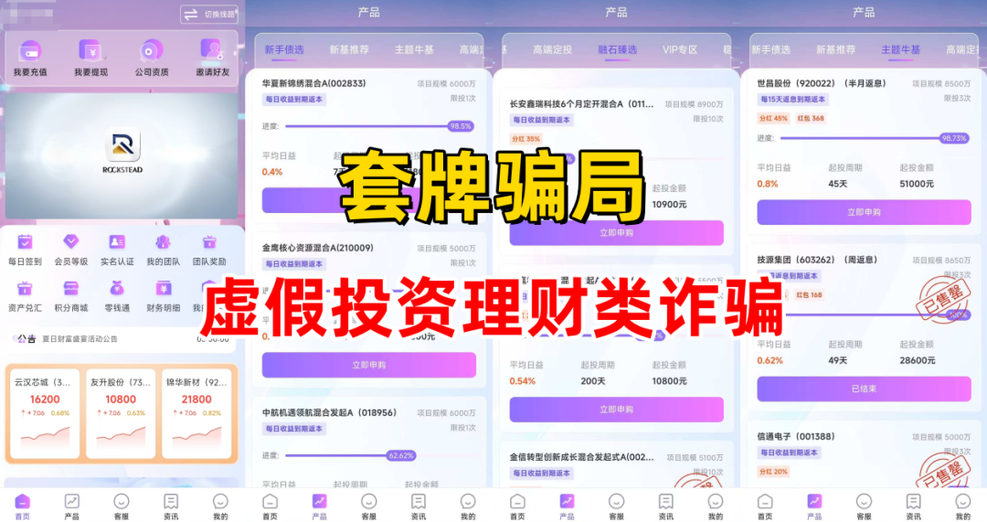 套牌理财诈骗。不法分子冒充境外合格投资者“融石资本”公司的名义,制作散布涉诈APP,虚构推广“华夏新锦绣混合A”“金鹰核心资源混合A”“中航机遇领航混合发起A”“长安鑫瑞科技6个月定开混合A”“永赢科技智选混合发起A”等日收益率0.38%-0.8%高额理财项目。